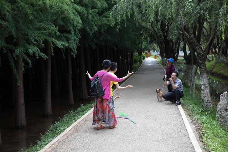 7月21日,游客在滇池東岸撈魚河濕地公園留影。 云南省昆明市撈魚河濕地公園位于滇池東岸。近年來,通過當(dāng)?shù)卣母脑旌椭卫?,撈魚河濕地公園整體環(huán)境得到明顯改善。 新華社記者 金立旺 攝