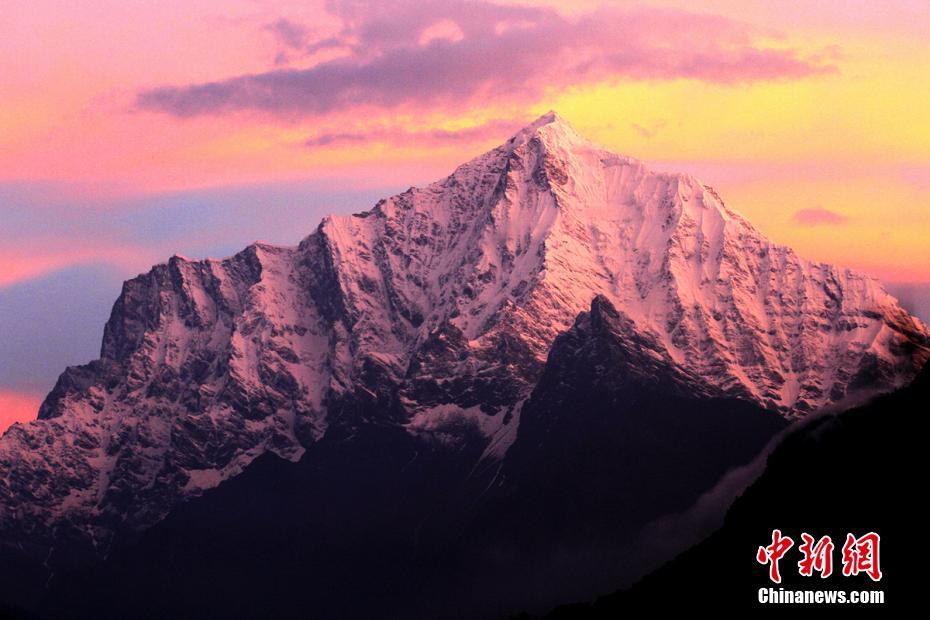 吉隆溝給人最大的感受是驚訝于造物的神奇,讓四季并存在這狹小的山谷間。峽谷綠樹(shù)成蔭,恬靜的村莊被綠樹(shù)環(huán)抱著,不遠(yuǎn)處能清楚地看見(jiàn)若隱若現(xiàn)的雪山。圖為紅霞映雪山。 楊建 攝