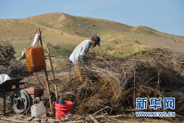 在內(nèi)蒙古鄂爾多斯市杭錦旗,工人為新修的穿沙公路制作沙障(7月26日攝)。新華社記者 鄒予 攝