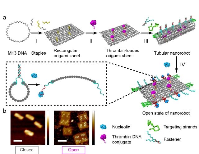 該團隊的丁寶全研究員通過精準控制,將一種包含7000多個堿基的噬菌體的DNA單鏈分子折成長方形板,放上四個“殺手”——凝血酶分子,然后再將其卷起來,接口處安裝用核仁素DNA片段做的“鎖”,最終形成90納米長、直徑為19納米的管狀機器人。