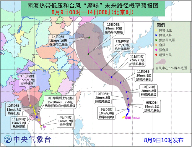 今年第14號(hào)臺(tái)風(fēng)“摩羯”昨天在臺(tái)灣以東洋面生成。預(yù)計(jì)“摩羯”將于11日夜間進(jìn)入東海東部海面,之后在我國(guó)東部海區(qū)北上,強(qiáng)度逐漸加強(qiáng)到強(qiáng)熱帶風(fēng)暴級(jí)(10~11級(jí),25~30米/秒)。12日至14日,東海北部、黃海將先后出現(xiàn)7~9級(jí)大風(fēng),臺(tái)風(fēng)中心經(jīng)過的海域風(fēng)力有10~11級(jí)、陣風(fēng)12~13級(jí)。