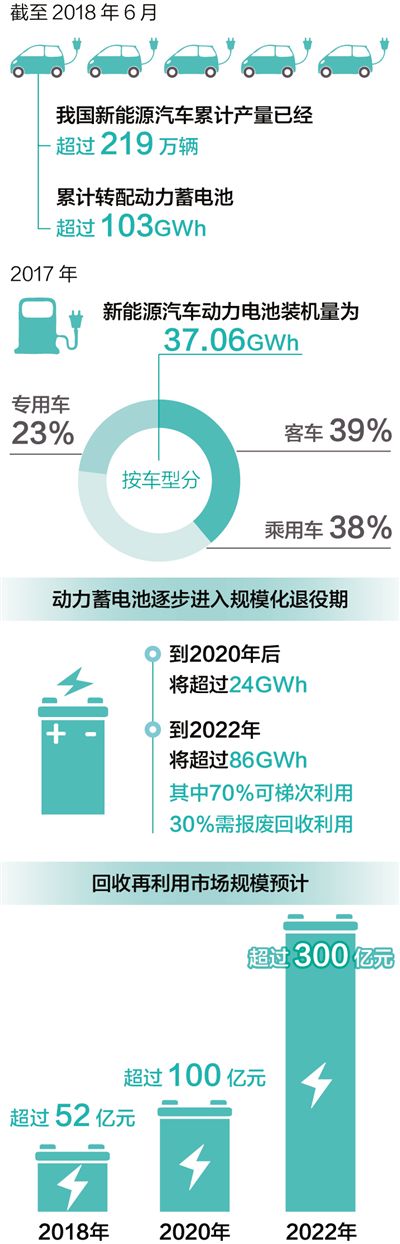 據(jù)預(yù)測,新能源汽車動力蓄電池回收再利用市場規(guī)模巨大:預(yù)計市場規(guī)模在2018年超過52億元,2020年將超過100億元,2022年將超過300億元。也就是說,動力蓄電池回收再利用不僅是環(huán)保所需,還有著不小的經(jīng)濟效益。