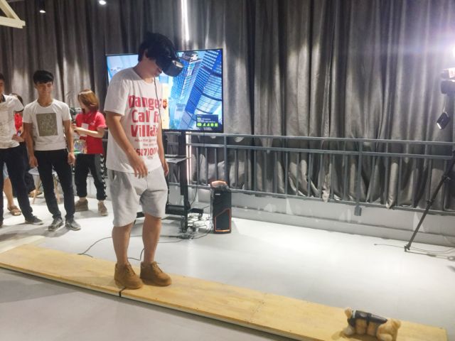 在山路騎行體驗(yàn)區(qū),體驗(yàn)者需佩戴VR眼鏡騎車,屏幕上的山路場(chǎng)景會(huì)隨移動(dòng)轉(zhuǎn)換,時(shí)而上坡、時(shí)而急轉(zhuǎn)彎、時(shí)而平緩……車身也會(huì)隨場(chǎng)景左右擺動(dòng)。在高空涉險(xiǎn)體驗(yàn)區(qū),參與者小心翼翼的在平地上移動(dòng)著腳步,原來(lái)在vr的世界里面,體驗(yàn)者正站在高樓外狹窄的木板上試圖“營(yíng)救”蜷縮在木板盡頭的“虛擬”小貓。