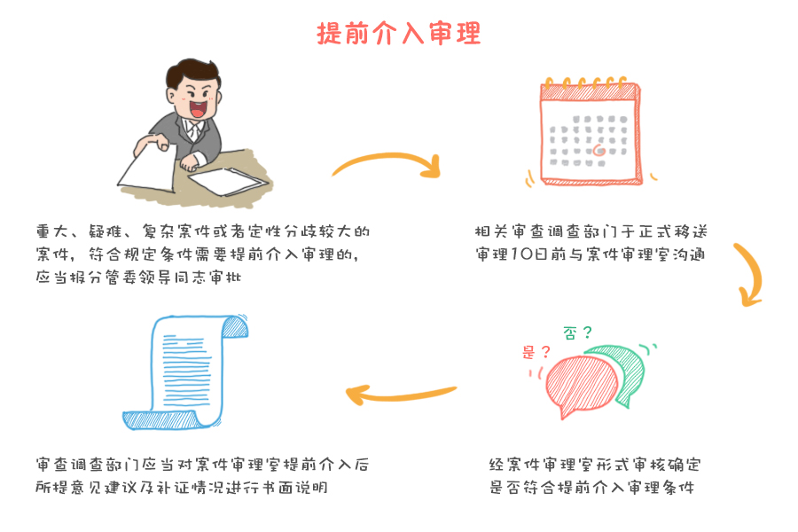 以提前介入審理為例,該規(guī)范明確,對(duì)于重大、疑難、復(fù)雜案件或者對(duì)違紀(jì)行為性質(zhì)認(rèn)定分歧較大的案件,符合規(guī)定條件需要提前介入審理的,相關(guān)審查調(diào)查部門應(yīng)當(dāng)在報(bào)分管委領(lǐng)導(dǎo)同志審批后,于正式移送審理10日前與案件審理室溝通,經(jīng)案件審理室形式審核確定是否符合提前介入審理?xiàng)l件。審查調(diào)查部門應(yīng)當(dāng)對(duì)案件審理室提前介入后所提意見建議及補(bǔ)證情況進(jìn)行書面說明。