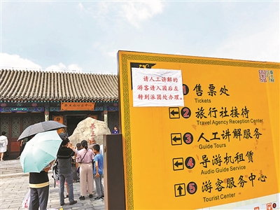 14日下午,北青報(bào)記者來到了恭王府博物館。正值暑期,景區(qū)大門外的廣場上聚集了眾多游客,其中有些是旅行團(tuán)整團(tuán)參觀,還有一些是散客。