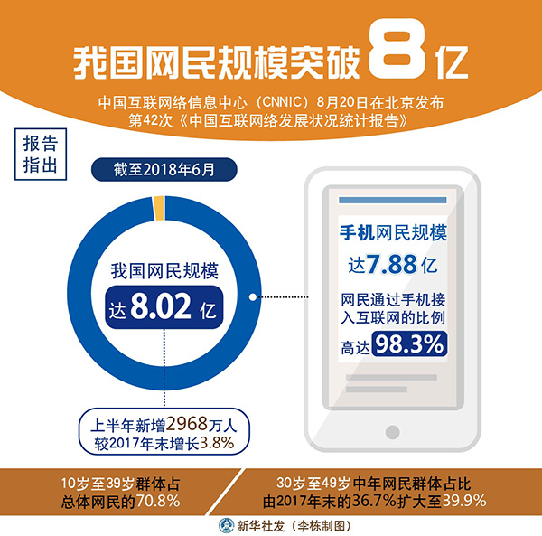 新華社北京8月20日電(記者王思北、施雨岑)中國互聯網絡信息中心(CNNIC)20日在京發(fā)布第42次《中國互聯網絡發(fā)展狀況統計報告》。報告指出,截至2018年6月,我國網民規(guī)模達8.02億,上半年新增網民2968萬人,較2017年末增長3.8%,互聯網普及率達57.7%;手機網民規(guī)模達7.88億,網民通過手機接入互聯網的比例高達98.3%。