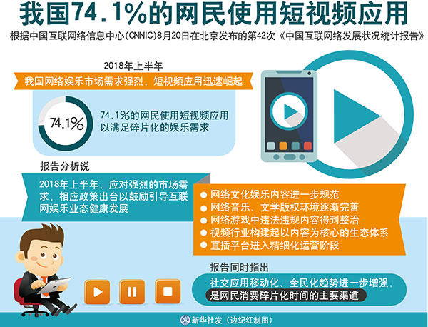 新華社北京8月20日電(記者施雨岑、王思北)根據中國互聯(lián)網絡信息中心(CNNIC)20日在京發(fā)布的第42次《中國互聯(lián)網絡發(fā)展狀況統(tǒng)計報告》,2018年上半年,我國網絡娛樂市場需求強烈,短視頻應用迅速崛起,74.1%的網民使用短視頻應用,以滿足碎片化的娛樂需求。