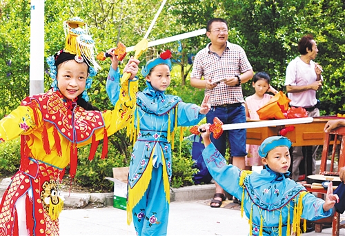 江蘇省海安市經(jīng)濟(jì)技術(shù)開發(fā)區(qū)戲曲小票友在社區(qū)為居民表演京劇,豐富假日生活。 李曉亮攝