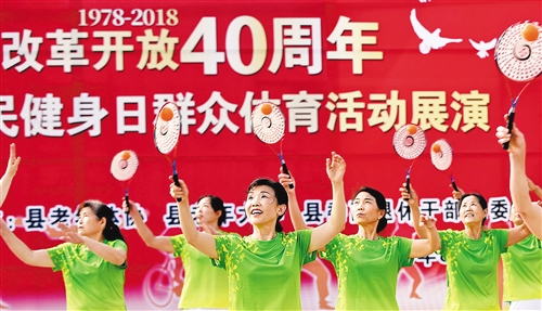 湖北省襄陽市南漳縣舉行群眾體育活動(dòng)展演。上千名干部群眾分別展示了太極拳劍、健身氣功、柔力球、廣場(chǎng)舞等精彩節(jié)目,紀(jì)念改革開放40周年。 熊明銀攝