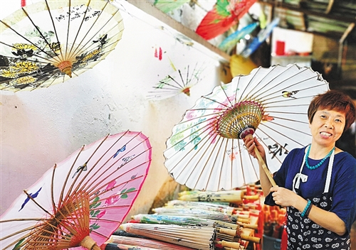 貴州省赤水市大同古鎮(zhèn),油紙傘傳人李珍霞在展示她制作的油紙傘。大同古鎮(zhèn)歷史悠久,擁有“獨(dú)竹漂”、竹編、油紙傘等非物質(zhì)文化遺產(chǎn)。 經(jīng)濟(jì)日?qǐng)?bào)-中國(guó)經(jīng)濟(jì)網(wǎng)記者 周明陽攝