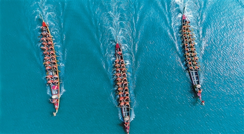 安徽省池州市舉辦的龍舟賽。龍舟競(jìng)渡是長(zhǎng)江流域影響最大、流傳最廣的民俗之一,體現(xiàn)了我國(guó)悠久的歷史文化傳承和百舸爭(zhēng)流、勇往直前的競(jìng)進(jìn)精神。 饒 頤攝