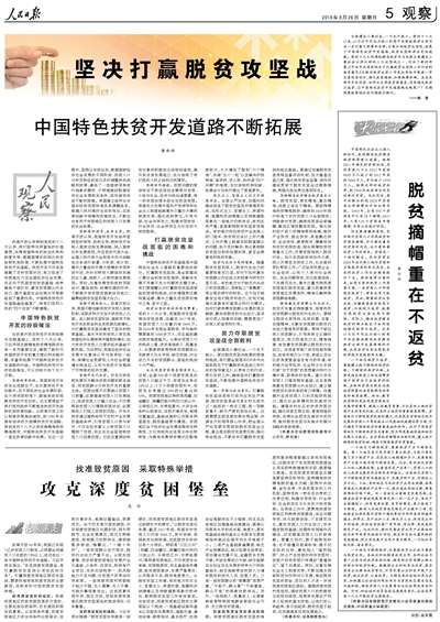 全面建成小康社會,一個也不能少。黨的十八大以來,以習(xí)近平同志為核心的黨中央圍繞脫貧攻堅作出一系列重大部署和安排,全面打響脫貧攻堅戰(zhàn),拓展了中國特色扶貧開發(fā)道路,脫貧攻堅取得決定性進(jìn)展。黨的十九大明確把精準(zhǔn)脫貧作為決勝全面建成小康社會必須打好的三大攻堅戰(zhàn)之一,作出了新的部署。《中共中央國務(wù)院關(guān)于打贏脫貧攻堅戰(zhàn)三年行動的指導(dǎo)意見》為推動脫貧攻堅工作更加有效開展進(jìn)一步完善頂層設(shè)計、強(qiáng)化政策措施、加強(qiáng)統(tǒng)籌協(xié)調(diào)。在未來兩年多時間里,如何攻克深度貧困堡壘,實現(xiàn)穩(wěn)定脫貧不返貧,讓中國特色扶貧開發(fā)道路越走越寬廣?本期觀察版圍繞這些問題進(jìn)行探討。