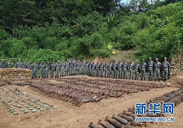 參訓(xùn)官兵到中越邊境麻栗坡某雷場參觀識別已搜排出的地雷及爆炸物(8月26日攝)。 新華社發(fā)(張輝 攝)