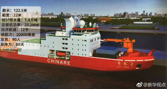 “雪龍2”號長122.5米,寬22.3米,吃水7.85米,吃水排水量約13990噸,航速12節(jié)至15節(jié),續(xù)航力2萬海里,自持力60天,載員90人,能以2節(jié)至3節(jié)的航速在冰厚1.5米+0.2米雪的環(huán)境中連續(xù)破冰航行。