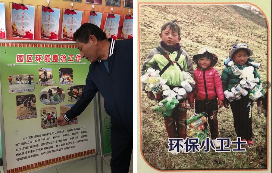 圖左為昂塞鄉(xiāng)鄉(xiāng)長旦增文秀向記者介紹“垃圾換文具”活動(dòng),圖右為學(xué)校評選出的“環(huán)保小衛(wèi)士”。人民網(wǎng)記者 余璐攝