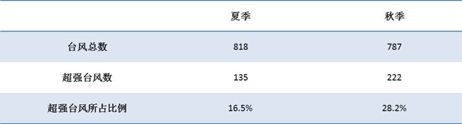根據(jù)西北太平洋和南海生成臺風(fēng)的歷史資料,常年夏季生成的臺風(fēng)數(shù)量比秋季生成的臺風(fēng)要多,登陸我國的臺風(fēng)數(shù)量也比秋季多。七八月份生成臺風(fēng)的個數(shù)比九月以后生成的秋臺風(fēng)要多,但秋季更易出現(xiàn)超強(qiáng)臺風(fēng)。1949年至2017年,秋臺風(fēng)共生成787個,其中超強(qiáng)臺風(fēng)有222個,占比28.2%;這期間,夏季臺風(fēng)中超強(qiáng)臺風(fēng)的比例則為16.5%。