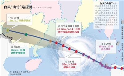 具體大風(fēng)預(yù)報(bào)顯示,15日20時(shí)至16日20時(shí),南海中北部、臺(tái)灣海峽、巴士海峽、臺(tái)灣島及其沿海、瓊州海峽、北部灣東部、福建沿海、廣東沿海及廣東中南部、珠江口、香港、澳門、海南島東部和北部沿海將有7-10級大風(fēng),陣風(fēng)11-12級;其中南海北部、廣東大部沿海、珠江口、香港、澳門將有11-13級大風(fēng),陣風(fēng)14-15級,“山竹”中心經(jīng)過的附近海面或地區(qū)風(fēng)力可達(dá)14-16級,陣風(fēng)17級或17級以上。