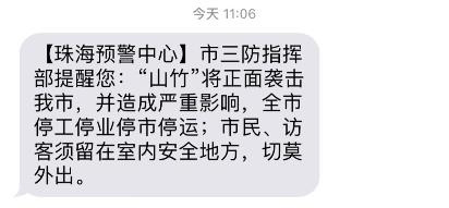 廣東珠海市民收到了來(lái)自珠海預(yù)警中心的短信:“切莫外出?!?/p>