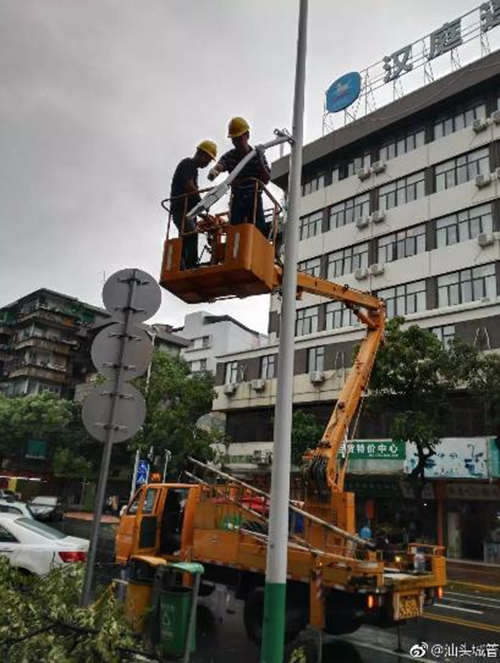 ▲臺(tái)風(fēng)來(lái)臨之際,汕頭市城照中心的工作人員,正在對(duì)被風(fēng)吹倒的路燈進(jìn)行應(yīng)急處置。