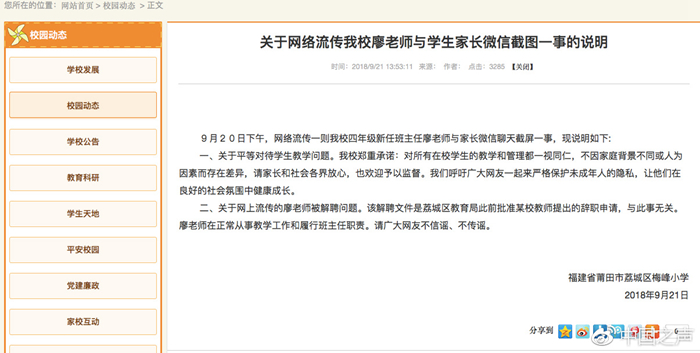 下午,涉事的莆田市荔城區(qū)梅峰小學(xué)在其官方網(wǎng)站發(fā)布消息,該解聘文件是荔城區(qū)教育局此前批準(zhǔn)某校教師提出的辭職申請(qǐng),與此事無關(guān)。廖老師在正常從事教學(xué)工作和履行班主任職責(zé)。
