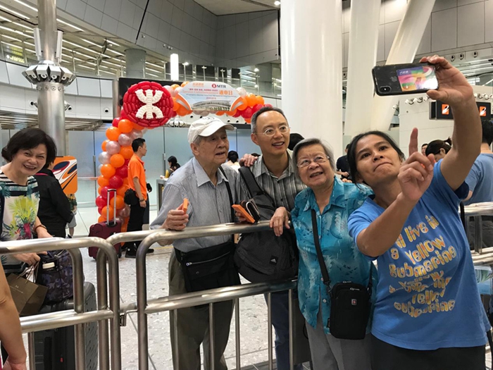 香港西九龍站, 80多歲家住深圳的黃奶奶送老伴和兒子去香港會(huì)見(jiàn)老朋友,“他們很多小時(shí)候的同學(xué)在香港,多年沒(méi)見(jiàn)了,今天通了高鐵,十幾分鐘就過(guò)來(lái)了?!?/p>