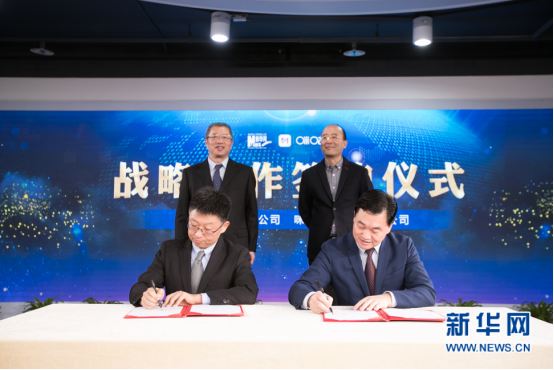 圖為新華網(wǎng)和咪咕公司簽署戰(zhàn)略合作協(xié)議。 新華網(wǎng) 郭小天 攝