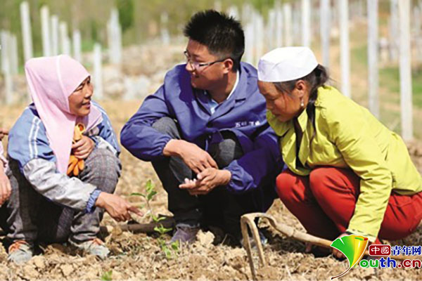 大學(xué)生村官翁新強(qiáng)指導(dǎo)農(nóng)民種植五味子。資料圖