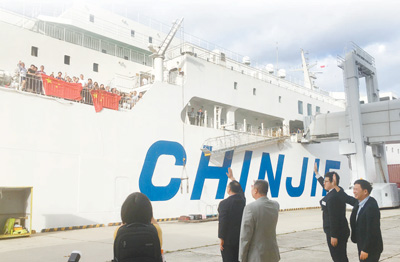 9月10日,中國駐大阪總領(lǐng)館工作人員把因臺風(fēng)滯留日本關(guān)西國際機(jī)場的部分中國旅客送上助其返鄉(xiāng)的“新鑒真”號。資料圖片