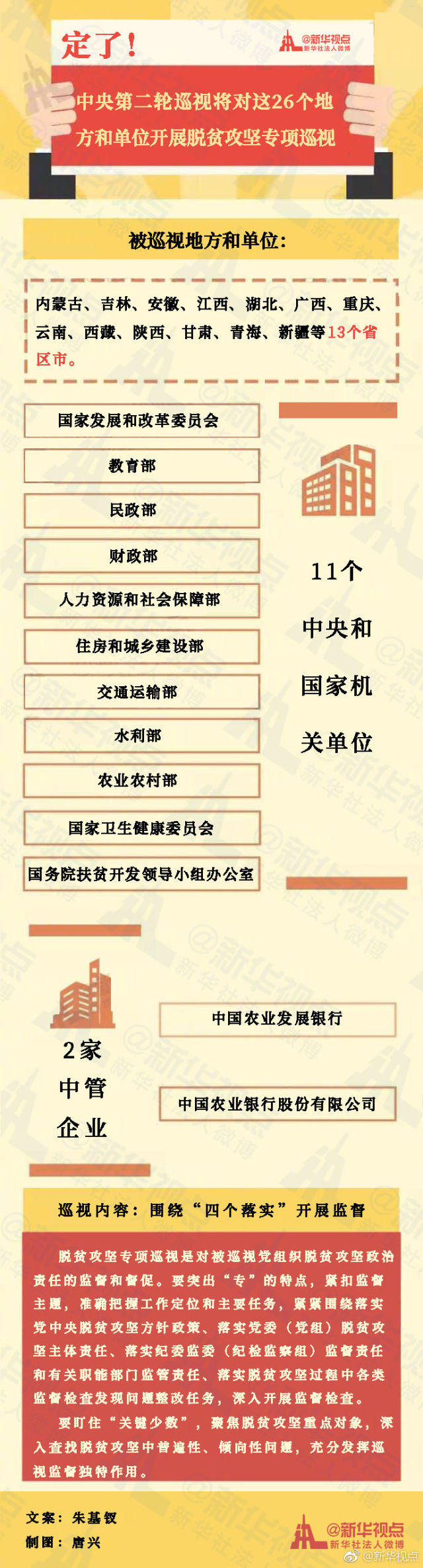 新華社北京10月9日電 經(jīng)黨中央批準,十九屆中央第二輪巡視將對內(nèi)蒙古、吉林、安徽、江西、湖北、廣西、重慶、云南、西藏、陜西、甘肅、青海、新疆、國家發(fā)展和改革委員會、教育部、民政部、財政部、人力資源和社會保障部、住房和城鄉(xiāng)建設部、交通運輸部、水利部、農(nóng)業(yè)農(nóng)村部、國家衛(wèi)生健康委員會、國務院扶貧開發(fā)領導小組辦公室、中國農(nóng)業(yè)發(fā)展銀行、中國農(nóng)業(yè)銀行股份有限公司等26個地方、單位黨組織開展脫貧攻堅專項巡視。
