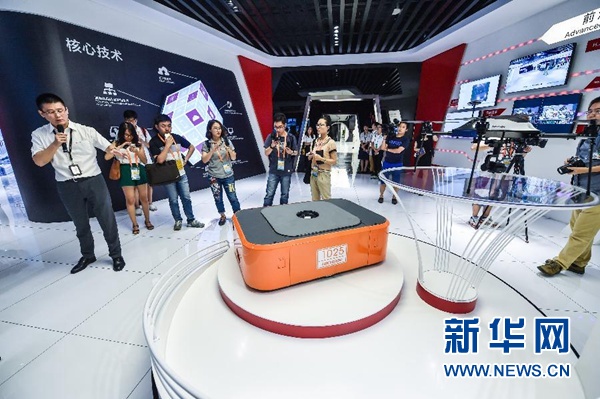 杭州??低晹?shù)字技術(shù)股份有限公司工作人員向記者介紹公司研發(fā)的物流機(jī)器人(2016年9月2日攝)。新華社記者 徐昱 攝