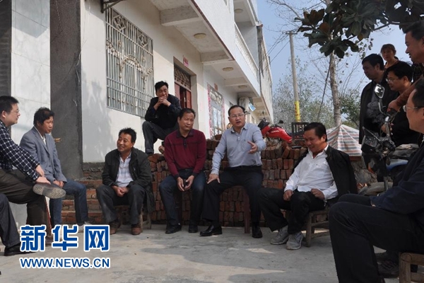 吳錦(左六)與群眾開“院子會”(2014年10月22日攝)。? 新華社發(fā)