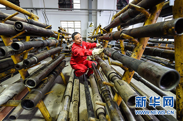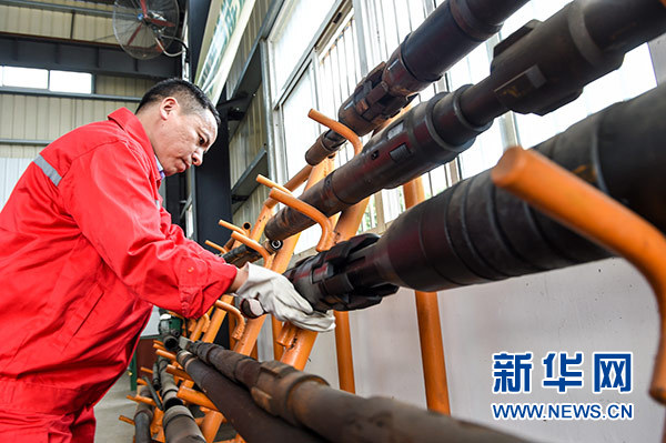 在中國石化江蘇油田工程技術(shù)服務(wù)中心,田明在檢查設(shè)備(10月9日攝)。新華社記者 李博 攝