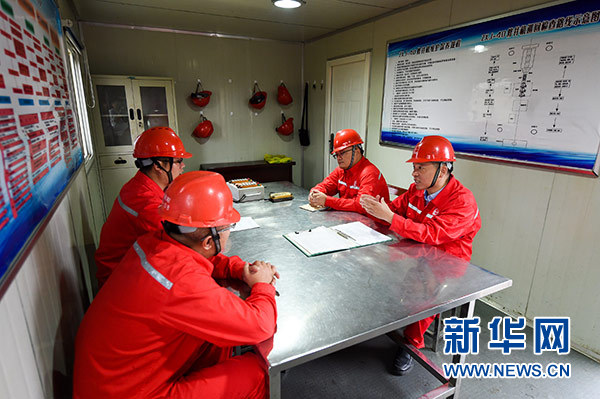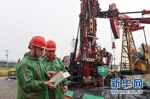田明(左)與團(tuán)隊(duì)工作人員在江蘇真武油田井場現(xiàn)場調(diào)試設(shè)備(10月9日攝)。新華社記者 李博 攝