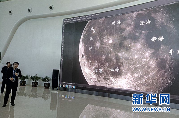 ↑↑相關(guān)負責人展示“吉林一號”拍回的月球表面圖像。
