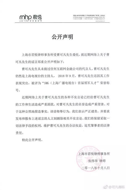 但事實(shí)上,主持人曹可凡國(guó)慶節(jié)前后多次參加公眾活動(dòng),國(guó)慶期間也曾發(fā)布過(guò)微博。但這些都沒能有效阻止謠言傳播,最終還是靠曹可凡本人委托的一封律師函,方才真相大白。