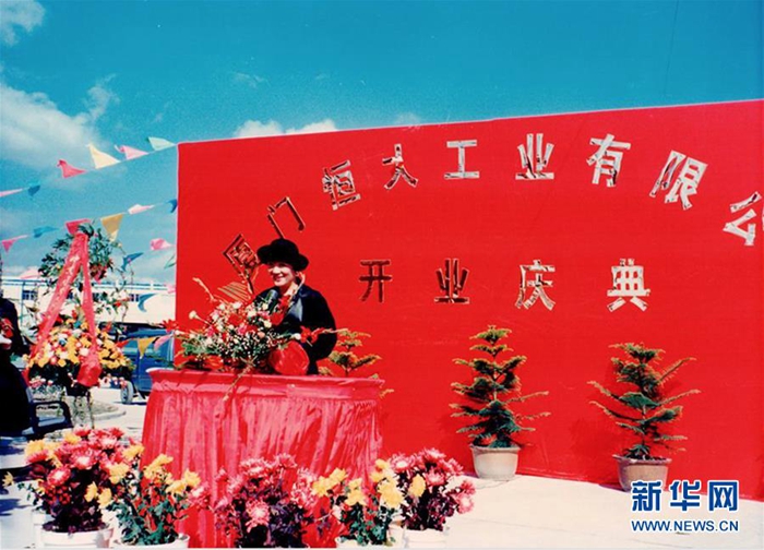 上世紀(jì)90年代初,黃紫玉在廈門的公司成立時(shí)站在紅色背景板前講話(受訪者供圖)。 新華社發(fā)