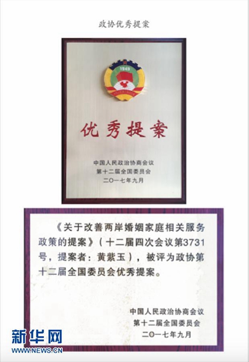 黃紫玉的《關(guān)于改善兩岸婚姻家庭相關(guān)服務(wù)政策的提案》被評(píng)為政協(xié)第十二屆全國(guó)委員會(huì)優(yōu)秀提案(受訪者供圖)。新華社發(fā)