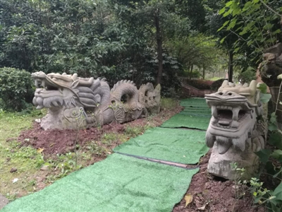 11月5日上午,記者在瑞豐公館小區(qū)看到,兩條巨龍還安放在8號(hào)樓下面的過道邊,石像立在綠地的一棵樹下。一位綠化工人介紹,龍還沒搬進(jìn)來的時(shí)候,范順清在過道兩邊砌了一尺高的磚作為基座,后來不知被誰清理掉了,但后來兩條龍還是搬運(yùn)了進(jìn)來,直接放在土里。