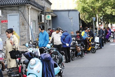 10月10日,新京報曾報道《新規(guī)實施在即 電動車扎堆上牌》,調(diào)查發(fā)現(xiàn),國慶長假過后,有不少市民“扎堆兒”前往交管部門的非機動車登記站為電動自行車上牌,在部分登記站領(lǐng)牌甚至需要排隊數(shù)小時。