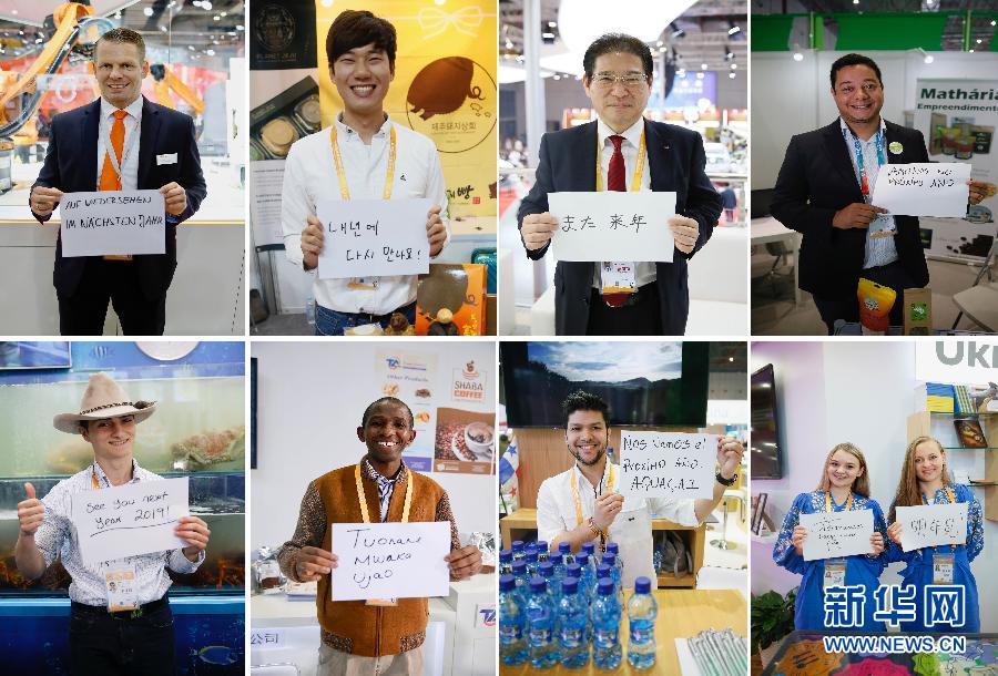 11月10日,進博會上不同國家的參展人員展示用不同語言書寫的“明年見”(拼版照片)。 首屆中國國際進口博覽會11月5日至10日在上海舉行。記者在采訪中了解到,很多參展商在進博會上收獲了不少訂單,宣傳了自己的產(chǎn)品,結(jié)識了很多朋友。他們表示,希望明年再來進博會。 新華社記者 侯東濤 攝