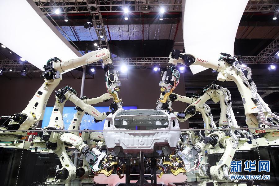 11月6日,日本那智不二越公司展出的點焊密集協(xié)作機器人在進行作業(yè)演示。 11月5日至10日,首屆中國國際進口博覽會在上海國家會展中心舉行。 新華社記者 丁汀 攝