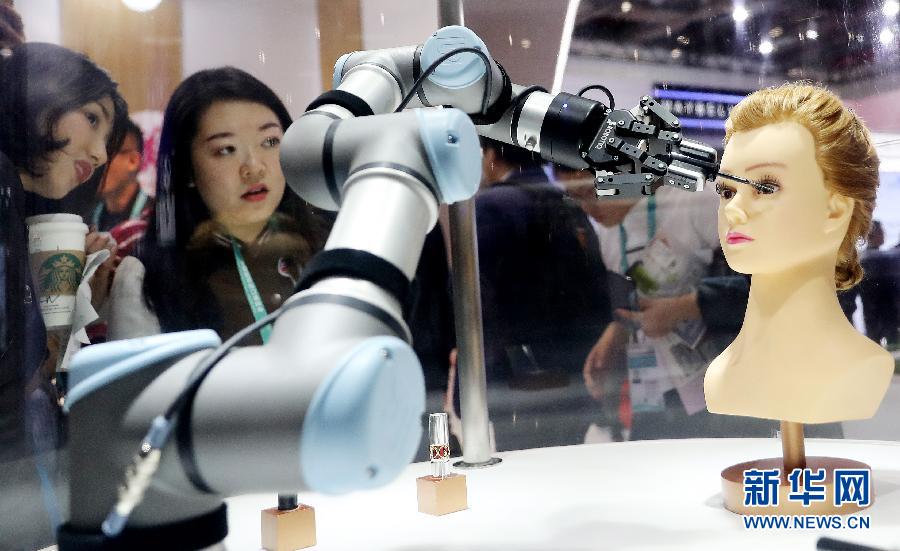 11月7日,參觀者在法國歐萊雅展臺觀看機器人作業(yè)演示。 休戚與共的地球村,共享創(chuàng)新成果已成為國際社會的共同意愿和現(xiàn)實選擇。透過進博會這個窗口可以看出,從上下游產(chǎn)業(yè)銜接到前沿領域合作,從協(xié)作共享資源到開放共享智慧,全球經(jīng)濟發(fā)展的新動能正在匯聚。 新華社記者 方喆 攝