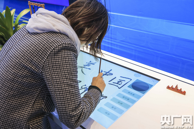 參觀者可以在電子屏幕上寫下“毛筆字”。(央廣網(wǎng)記者 荊宇琦 攝)