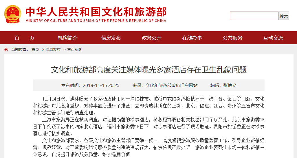 回應稱,11月14日晚,媒體曝光了多家酒店使用同一塊臟抹布、臟浴巾或臟海綿擦拭杯子、洗手臺、鏡面等問題。文化和旅游部對此高度重視,對涉事酒店進行了排查,立即責成其所在的上海、北京、福建、江西、貴州等五省市文化和旅游主管部門進行調查處理。
