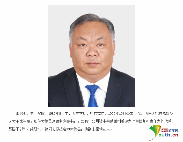 公示稱,李忠凱大學(xué)學(xué)歷,中共黨員,1999年10月參加工作。歷任大姚縣灣碧鄉(xiāng)人大主席等職。2018年10月被中共楚雄州委評為“楚雄州擔(dān)當(dāng)作為的優(yōu)秀基層干部”。