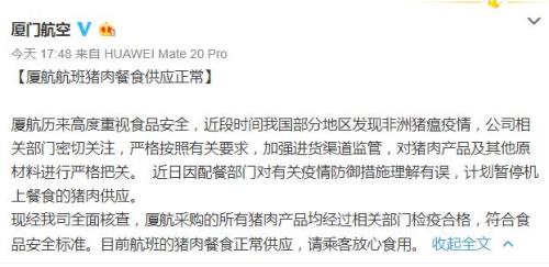 廈門航空24日在官方微博發(fā)布消息稱,廈航航班豬肉餐食供應(yīng)正常,其采購的所有豬肉產(chǎn)品均經(jīng)過相關(guān)部門檢疫合格,符合食品安全標(biāo)準(zhǔn)。