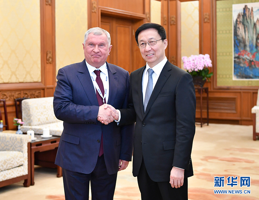 11月29日,中共中央政治局常委、國務(wù)院副總理韓正在北京釣魚臺國賓館會見來華出席中俄能源商務(wù)論壇的俄羅斯聯(lián)邦總統(tǒng)能源發(fā)展戰(zhàn)略和生態(tài)安全委員會執(zhí)行秘書、俄羅斯石油公司總裁謝欽。新華社記者 殷博古 攝