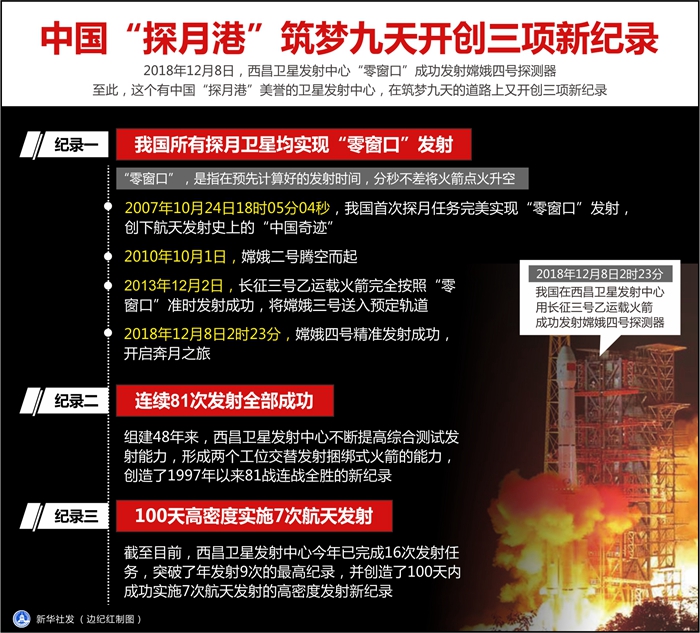 2018年12月8日,西昌衛(wèi)星發(fā)射中心“零窗口”成功發(fā)射嫦娥四號探測器。至此,這個有中國“探月港”美譽的衛(wèi)星發(fā)射中心,在筑夢九天的道路上又開創(chuàng)三項新紀錄。