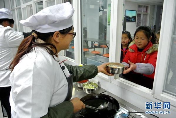 照金北梁紅軍小學(xué)學(xué)生在新啟用的餐廳排隊(duì)打飯(12月4日攝)。 新華社記者 梁愛平 攝