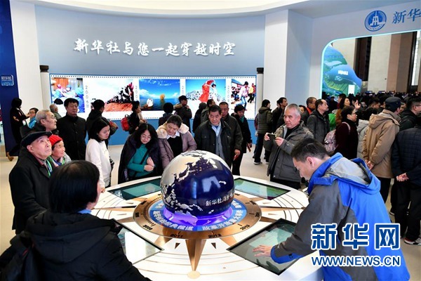 觀眾在新華社展項的“歲月羅盤”互動體驗項目前參觀。